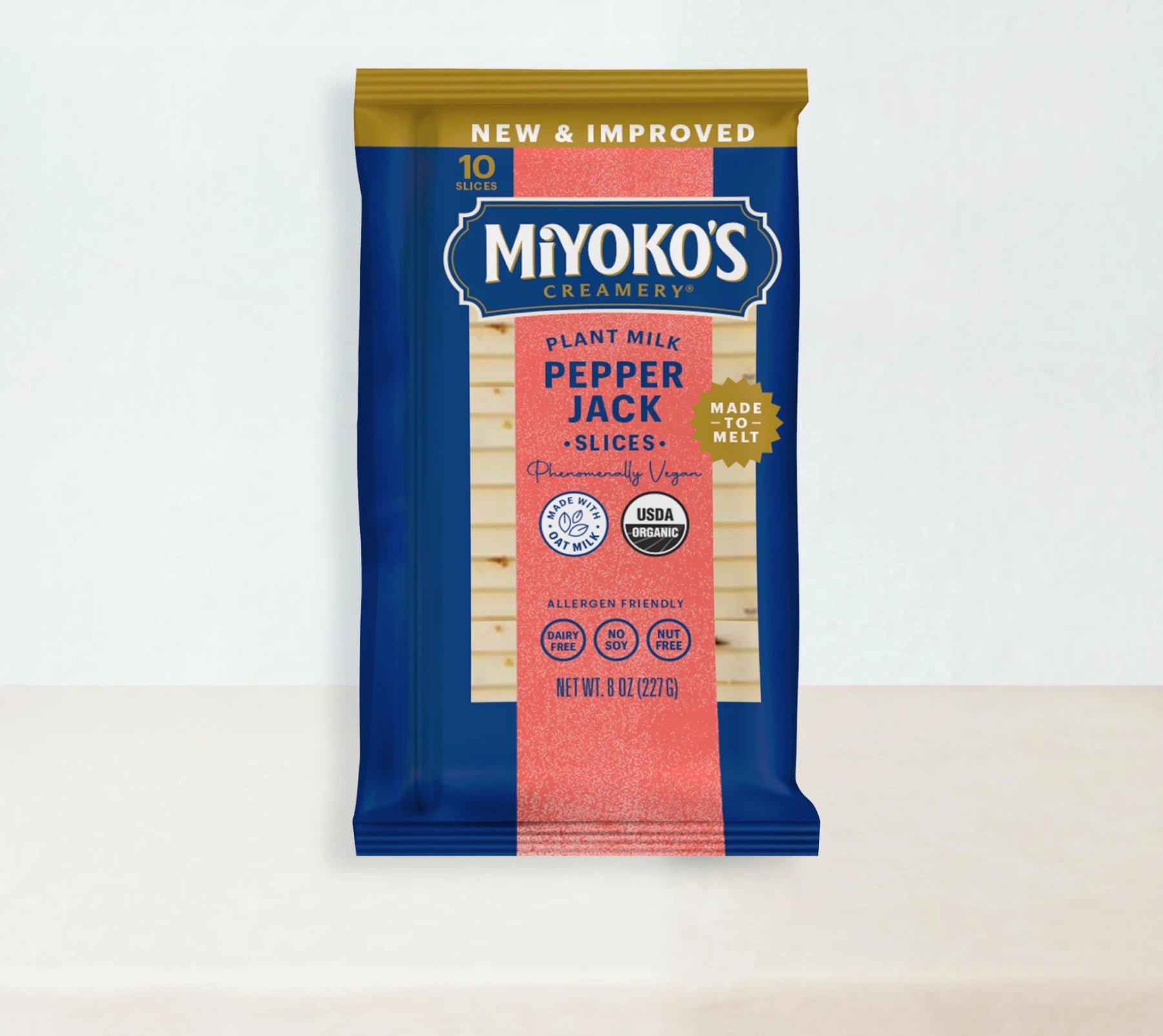 Made to melt and easy to add, these dairy-free cheese slices were crafted from organic oat milk, and simple ingredients. Add a slice to your breakfast sandwich or spice up your bagel with bold, pepper jack flavors, the perfect hint of jalapeno, and a gooey, cheesy texture.